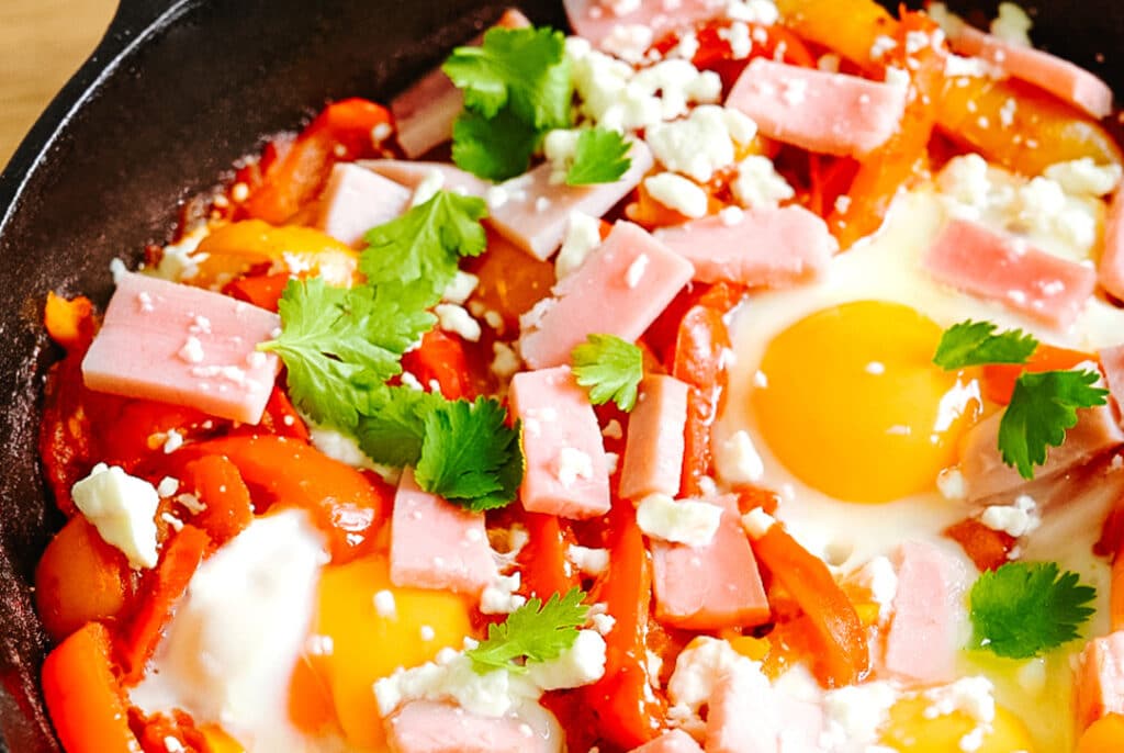 5. Au moment de servir, incorporez les lamelles de jambon puis cassez les œufs directement sur les légumes. Laissez cuire quelques minutes, jusqu’à ce que les œufs soient pris.