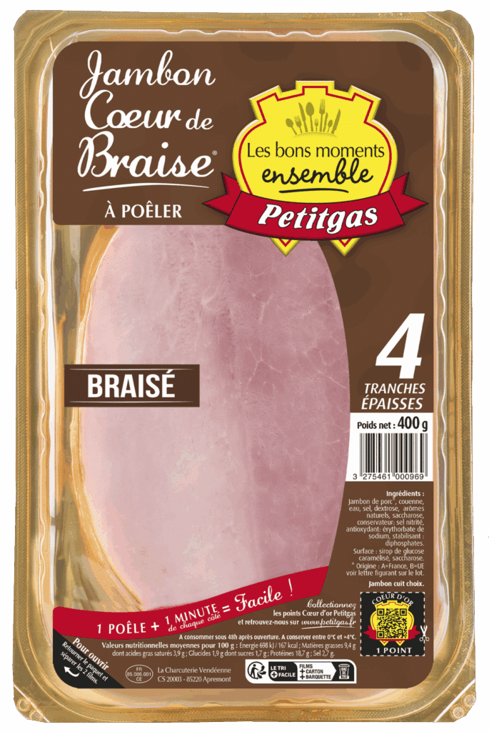 Faites revenir les tranches de Jambon Cœur de Braise dans une poêle chaude jusqu’à ce qu’elles soient bien cuites, puis coupez-les en lamelles.