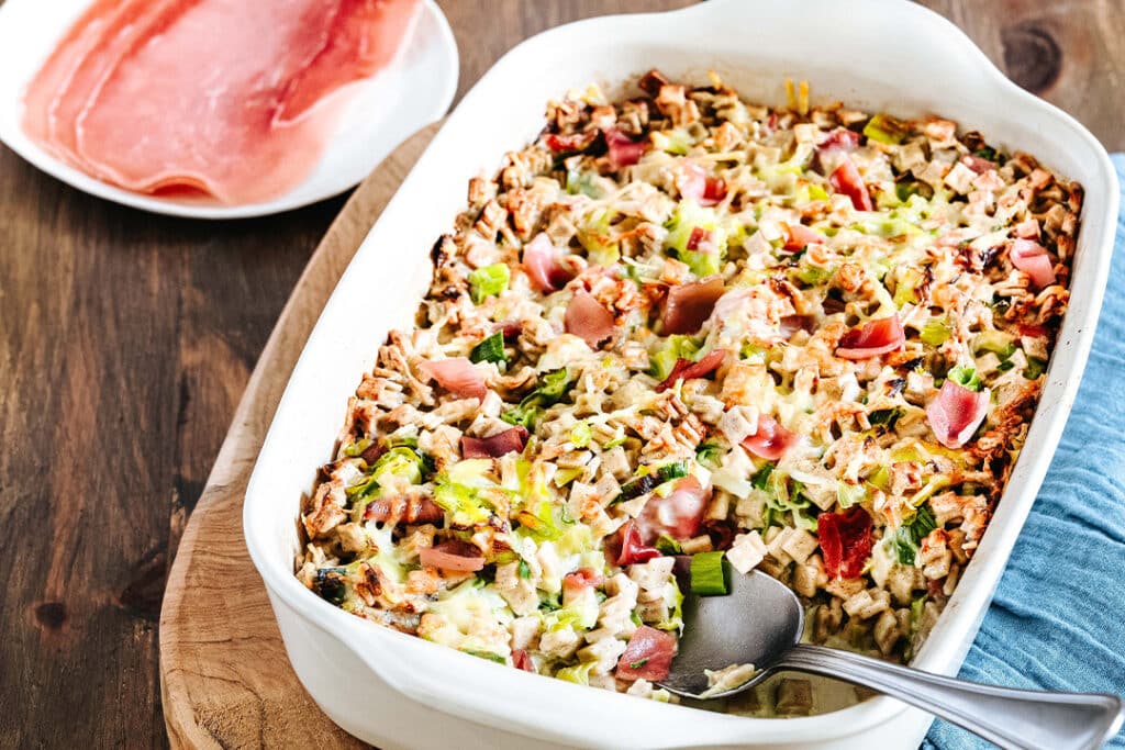 Gratin de crozets, poireaux, compté et jambon de Vendée IGP.