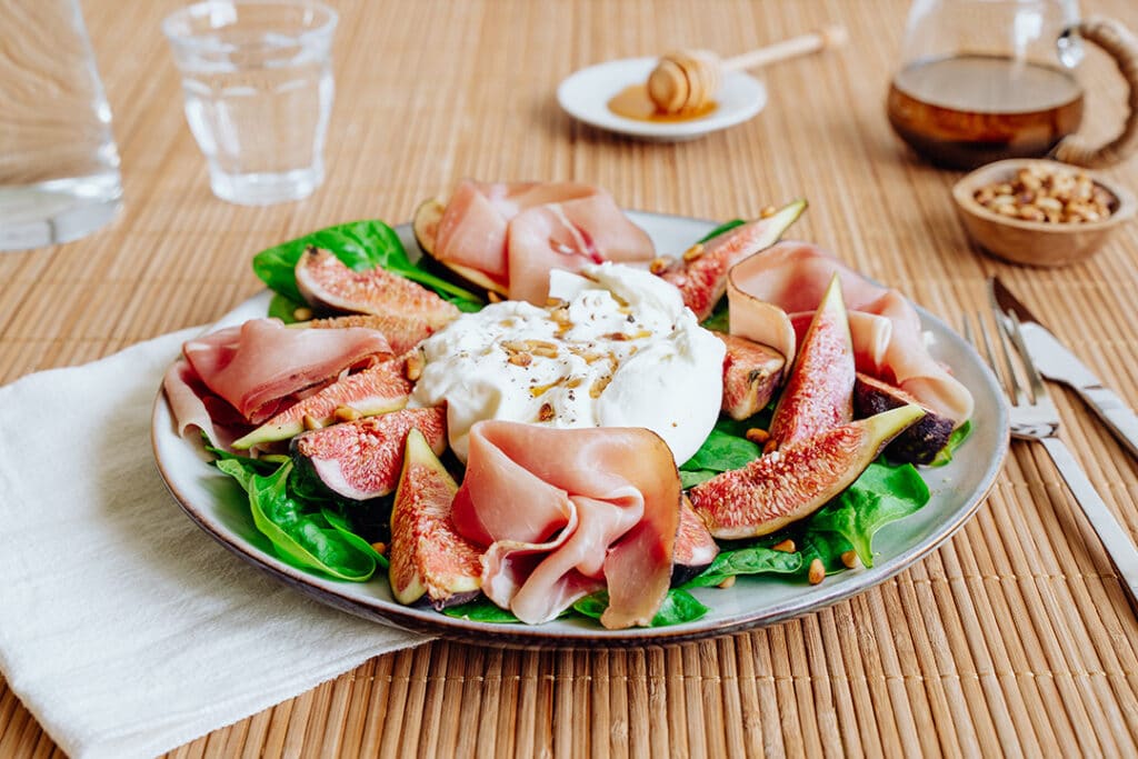 Salade au Jambon de Vendée IGP, figues, épinards et burrata