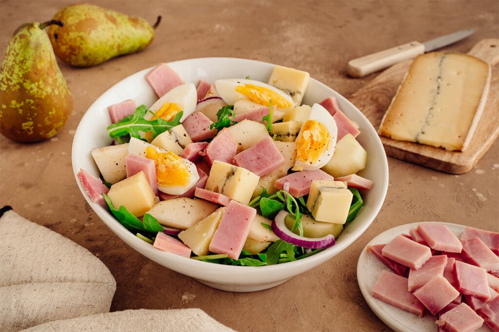 Salade au Jambon Fumé-Grill, pommes de terre, œuf dur, morbier et poire