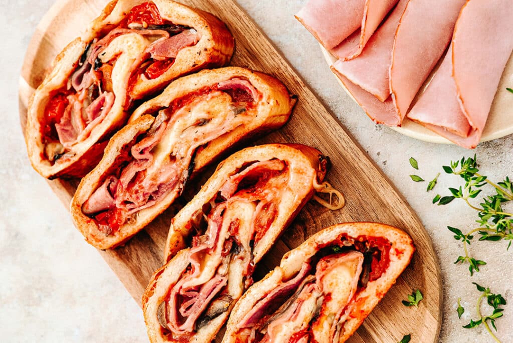 7. Enfournez 20 à 25 minutes à 200°C, jusqu’à ce que le Stromboli soit bien doré et croustillant.