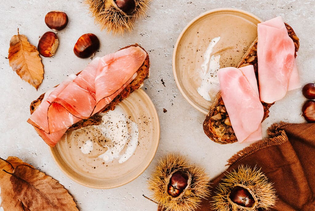 4. Servir le velouté bien chaud. Déposer une quenelle de ricotta. Compléter avec quelques champignons frais préalablement poêlés, puis disposer délicatement des lamelles de jambon de Vendée pour apporter du relief et du goût.
